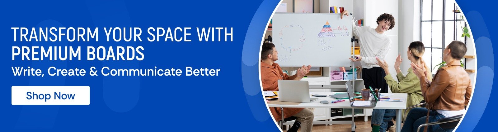 Explore our premium collection of whiteboards, glass boards, cork boards, blackboards, and essential accessories for every home, office, and classroom.