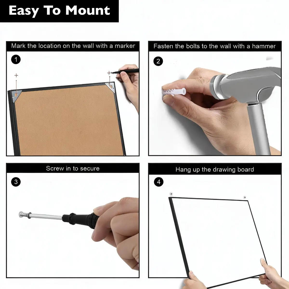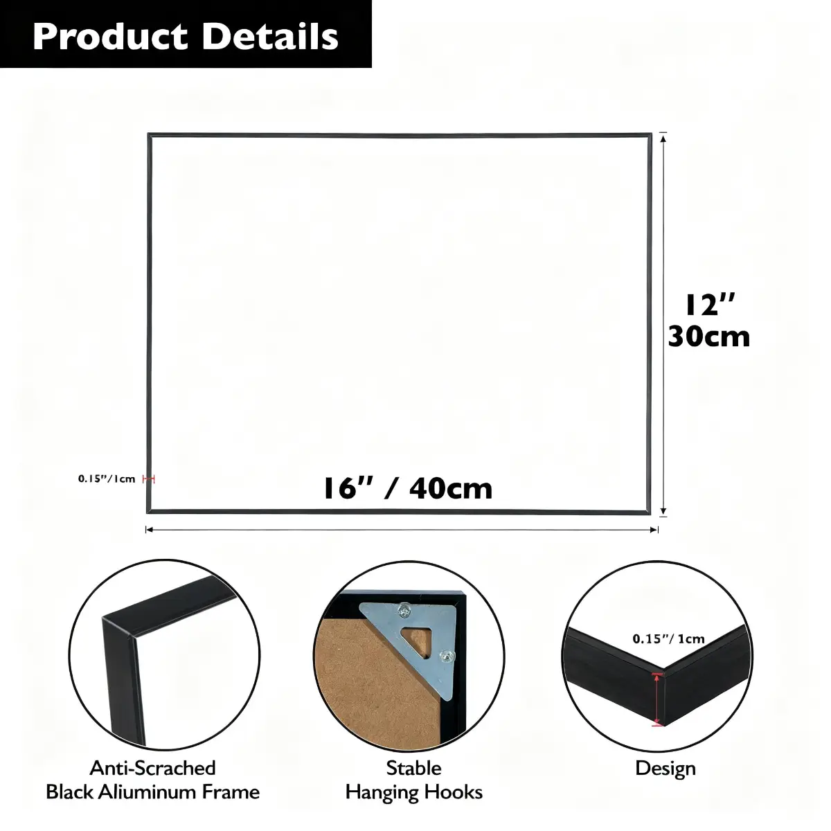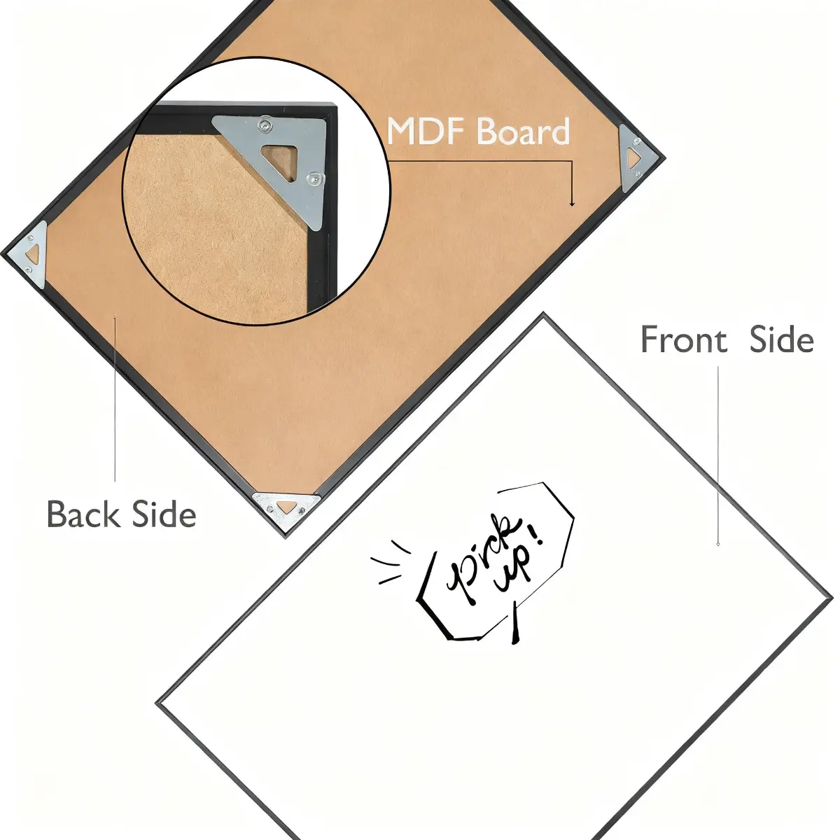 This single-sided whiteboard features a smooth dry erase surface, a durable black metal frame and practical hanging hooks for easy wall mounting. Simple, functional and easy to clean, it is ideal for home, school, office and everyday planning needs.