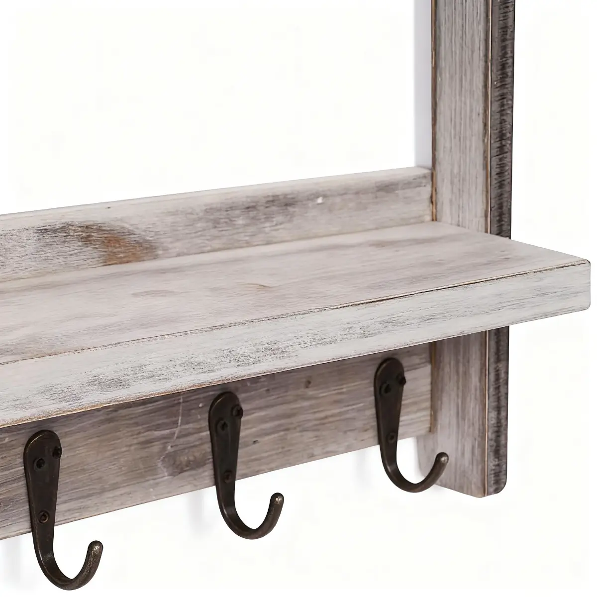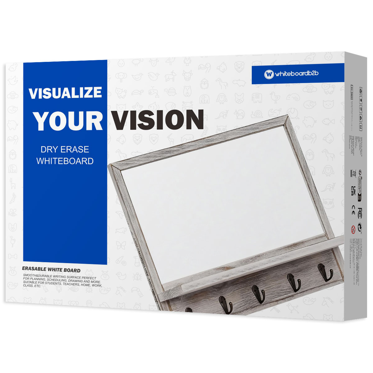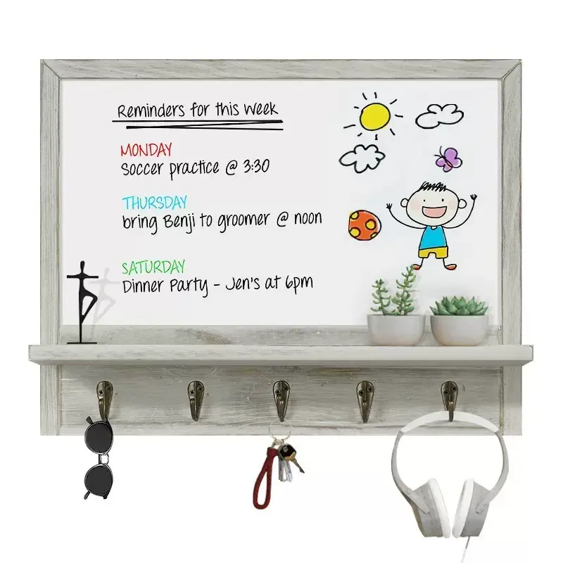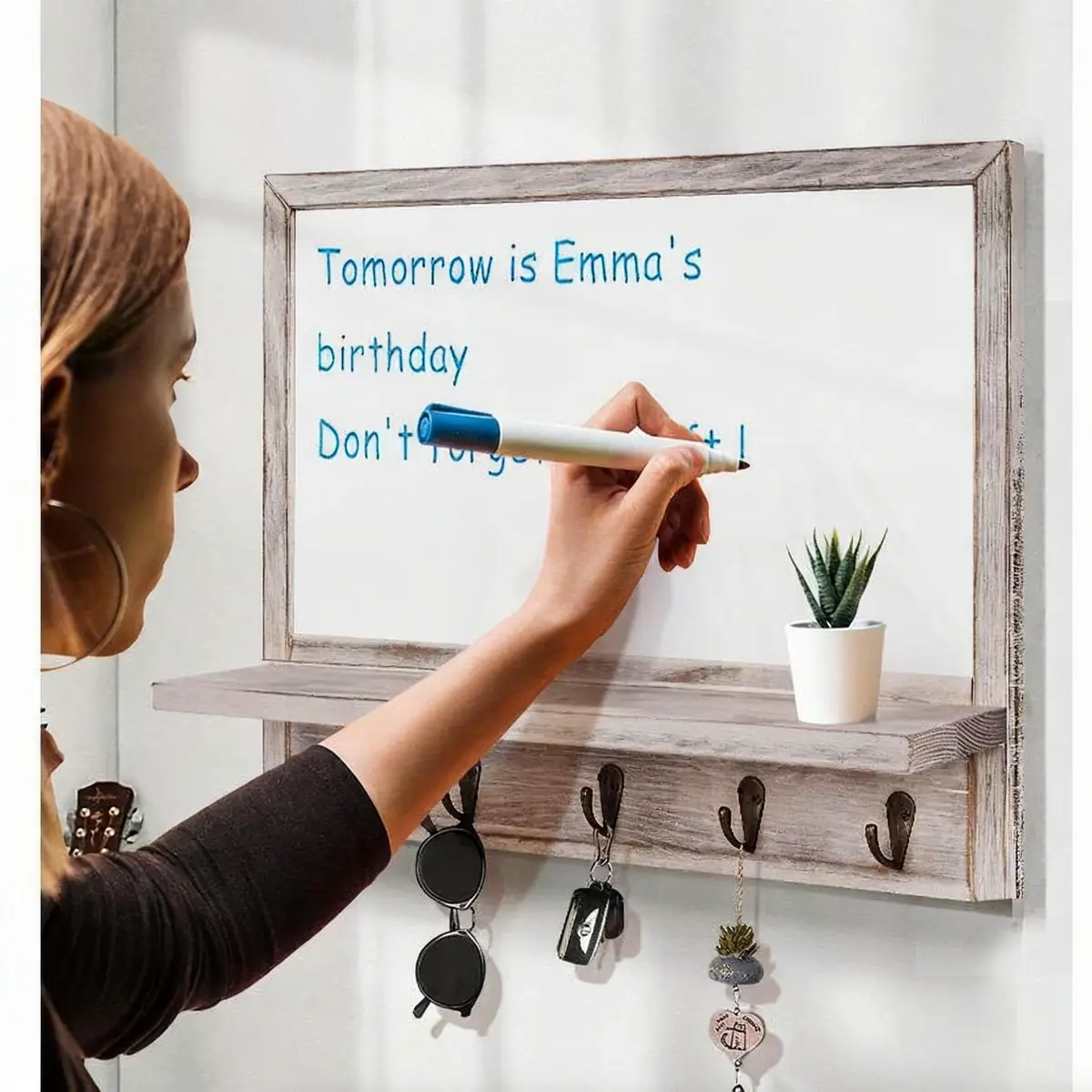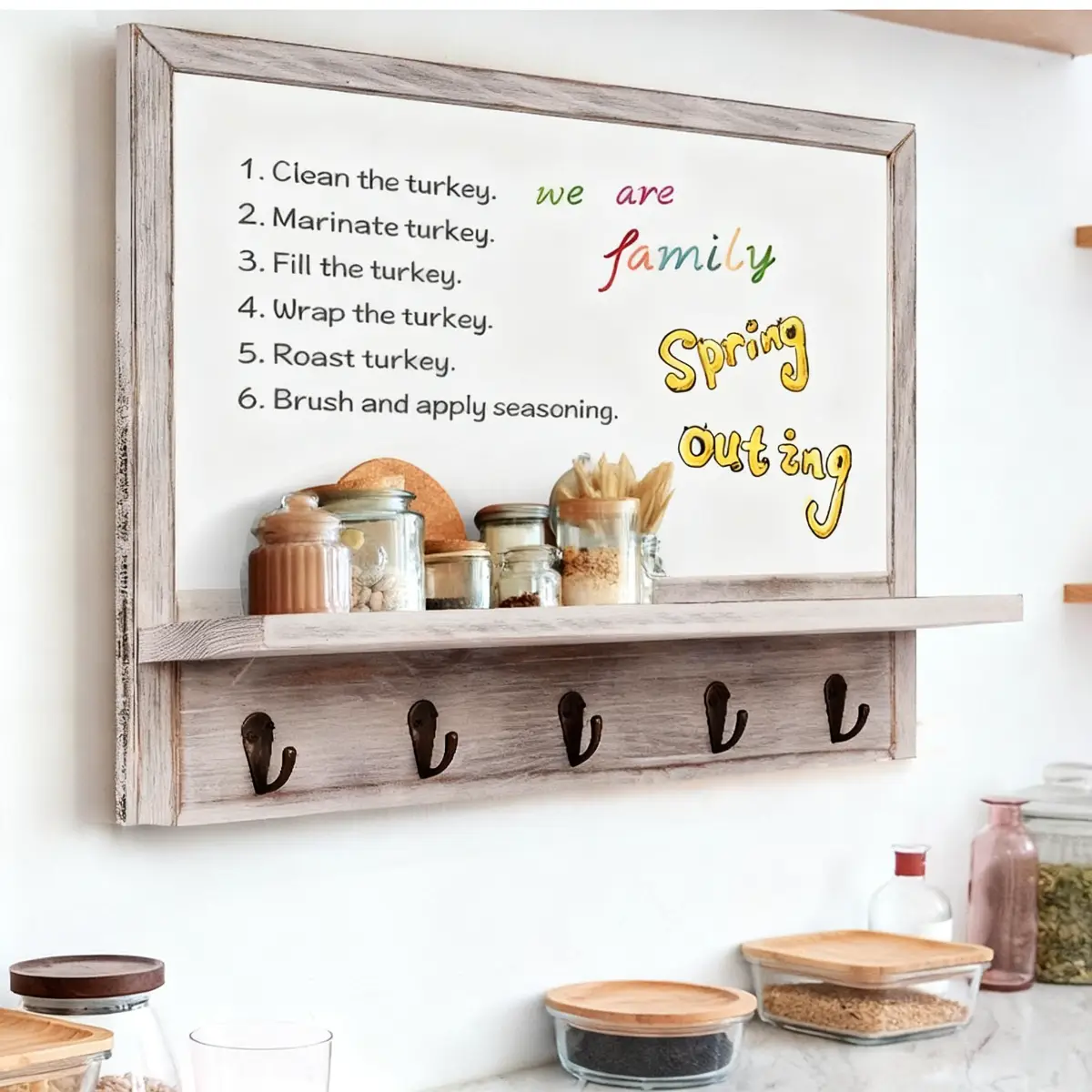 Rustic Magnetic Whiteboard Wall Organizer with Shelf and Hooks